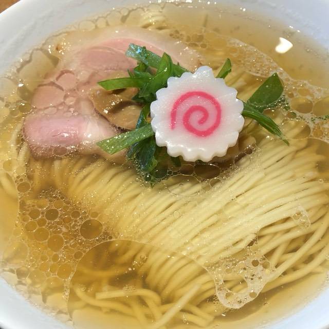長芋の千切りが乗ったラーメン。(写真左見切れ) 焼豚2枚と海苔の下にもやし、メンマ。 優しい味付け。 卓上に白胡椒とにんにく。