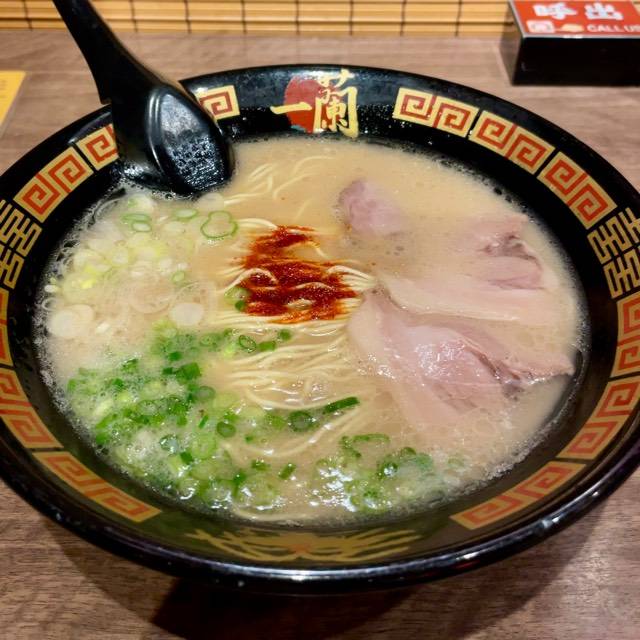 【訪問日 8月16】 お盆休みのなか、初めて一蘭に訪問。 味集中カウンターはかなり有名になったので、それだけは知っていたが、今日は初一蘭😃 12時前に到着で、並びは7人ほど。 ちゃんとグループ毎に席を準備して、案内も丁寧だった。 オーダー用紙にお好みで印をつ付け、店員に渡すと5分ほどで着丼。 スープをすすると、ほのかに甘味のあるスープで、豚骨臭さは皆無。サラッとしたスープに、細麺は硬めで注文したが、ちょっと粉っぽい食感の麺😢 ご馳走様でした〜🤗