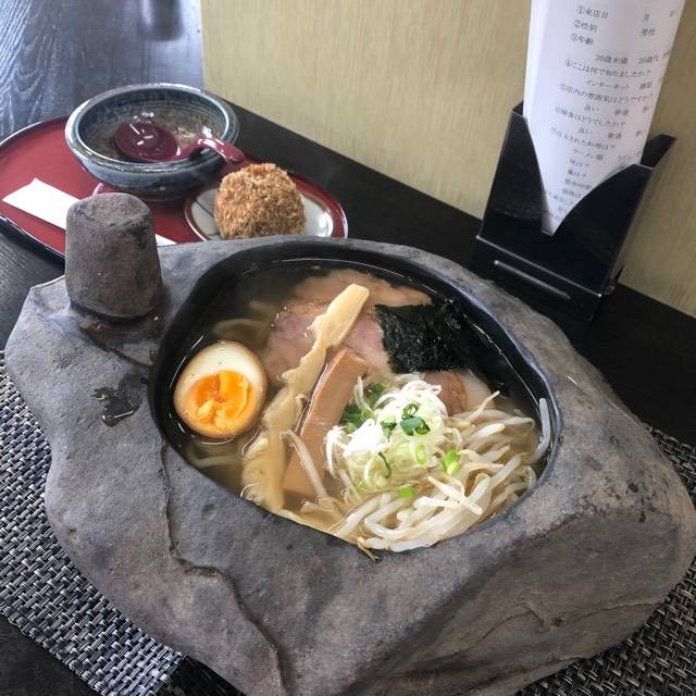 初訪問 UFO物産館にある食堂にピンカラ石ラーメンなるものを発見 行かねば🚗💨 ピンカラ石とはUFOを飛来させる力がある不思議な石らしい説があるようです 重量感のあるラーメンが登場 自分史上最重量級の器 あっさり醤油に中太縮れ麺 サイドにんだほボール(ライスコロッケ) ご馳走様でした