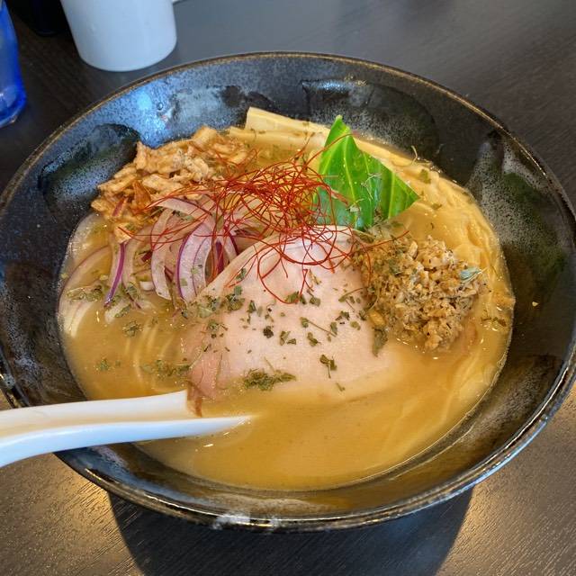 少しトロみのあるスープは貝感が強く味噌ダレともあって濃厚で甘みがあって実に美味しい。中太ストレート麺は加水少なめだが、パッツンまではいかず啜りやすい。このラーメンのキモと思われるトッピングが凄い。くし切りの紫玉ねぎ、ロースのレアチャーシュー、穂先メンマ、茹でキャベツ、糸唐辛子、フライドガーリック、特筆すべき牡蠣ペースト。仕上げに振り掛けられているのはドライバジルかな?いつものようにキャベツと玉ねぎの食感を楽しみつつ、口中をリセットさせ、一口目の感動を何回も楽しみ、ニ ガーリックと牡蠣ペーストで味わいと香りの変化を楽しむ。牡蠣ペーストは溶かすたびに変化が楽しめる。〆飯もリゾット風で美味しい。焦がしたチーズの香りとスイートチリの仄かな辛味と甘みがご飯の味を引き立てる。ごちそうさまでした。