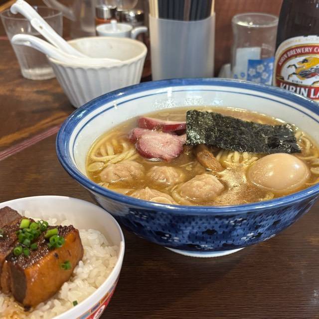気になっていた店へ初訪問。この日は並び無しだったが店内ほぼ満席に。外は暑く、冷たい瓶ビールを飲りつつラーメンを待つ時間が最高。 スープは各種出汁がじんわり沁みるスッキリしたタイプ。薄く油膜が張っていて熱々なのも良い。雲呑はヒレの部分が長めピロピロで食べ心地と食感も良くシンプルだが食べ応えもあり。煮玉子は固茹でで味がしっかり目でこの一杯に合っていた。 角煮ごはんは八角等の香りもついたもので追加して大正解。全体的に満足度高し。不定休で昼のみ営業なので少しハードルが高いがタイミングを見て再訪したい。