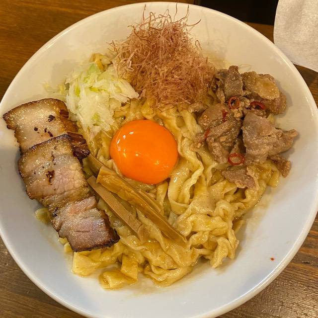 11時から2時間並んだ。食券買うタイミングは店員さんが指示してくれて分かりやすかった。 唐辛子の練られたモチモチの麺に、自家製の甘めのタレが絡んで美味。個人的にはお酢をかけてさっぱりさせるのも良いと思った。チャーシュー代わりに入っているほぐし肉(?)がタレ同様甘めの味付けで美味