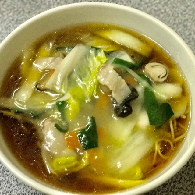 醤油味のラーメンの上に塩味の野菜たっぷりのあんかけがのる。