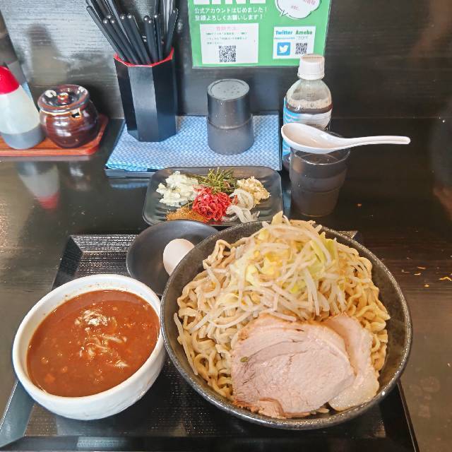 旨辛つけ麺大(冷)¥1100、麺増し¥0(グッズサービス)、生卵¥0(グッズサービス) 北浦和予定も昼営業に間に合わなそうだったのでこちらへ。 店長は厨房から出てこないから気付かれない😓 食後、店長を呼んでもらい挨拶😙 新都心店も限定をやるように喝を入れ、ご馳走様でした🙇