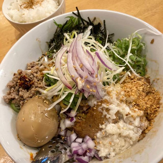 ブラックまぜそば+背脂+ニンニク+ライス(1260円)