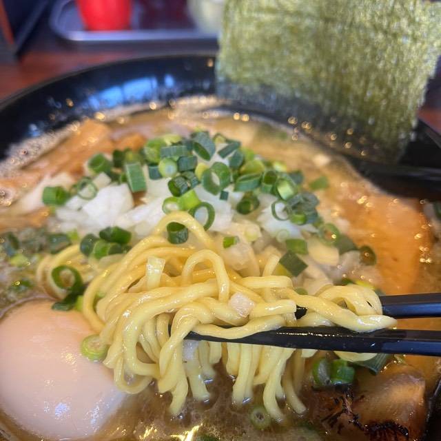 濃厚なスープと少し平たいカットの麺がよく絡んで美味しいです👍