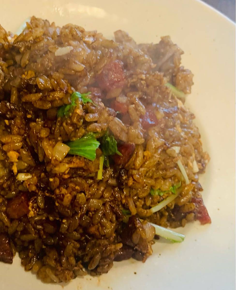写真は「中国ソーセージと玉ねぎの黒炒飯」