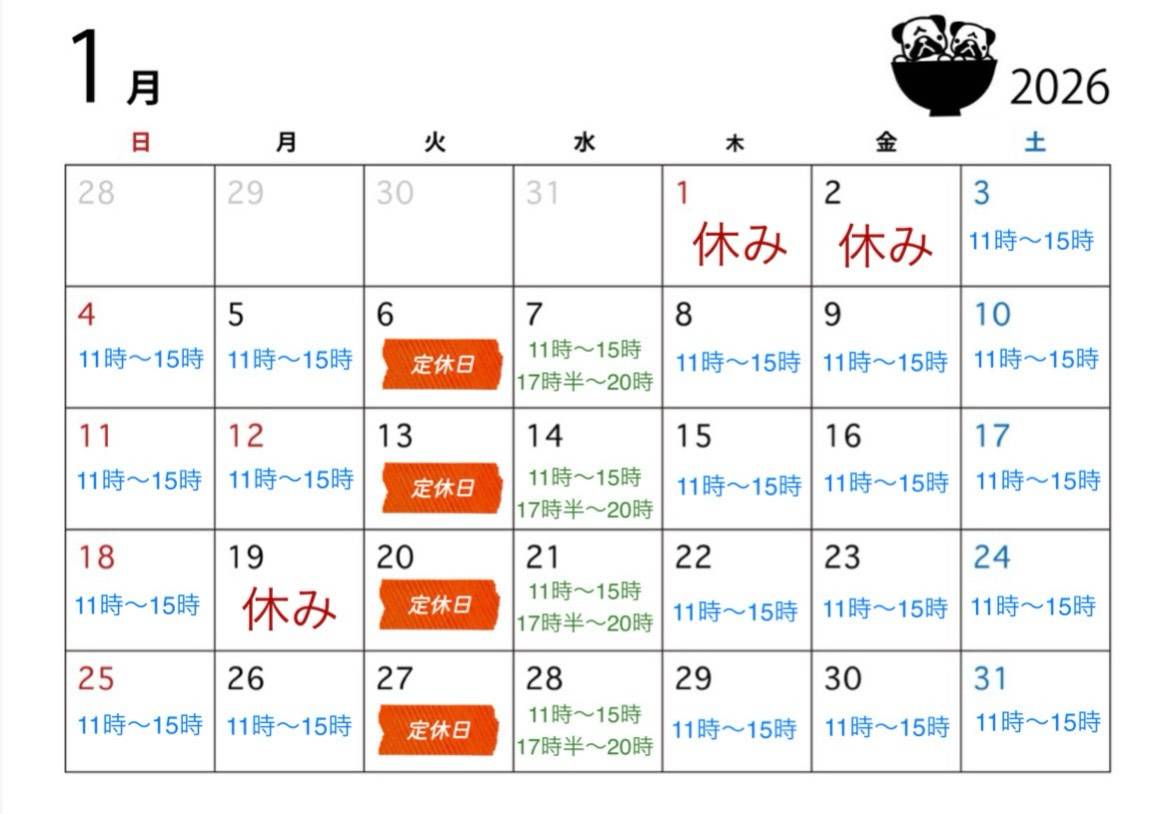 1月の営業カレンダーです