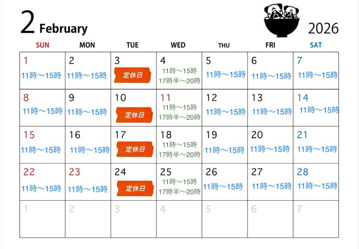 2月の営業カレンダーです