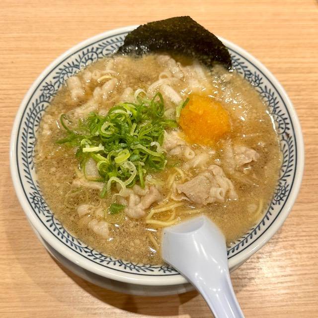 やわらかな豚肉をスープで炊き込むことでスープの旨みを染み込ませました。 麺に肉とスープの旨みが絡み、口の中に広がる至福の味! スープはトロッとまろやかな味。それが丸源名物「肉そば」。