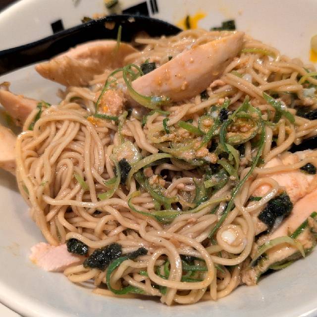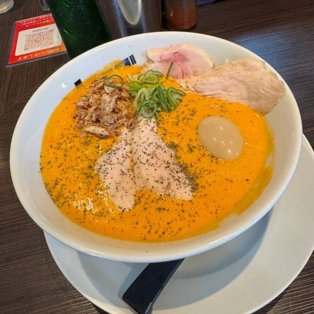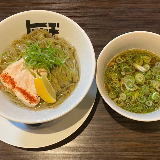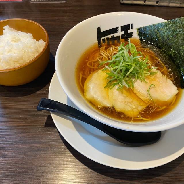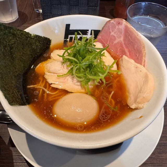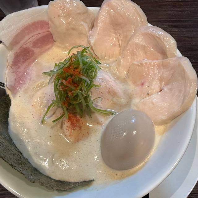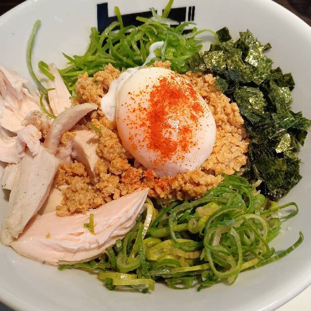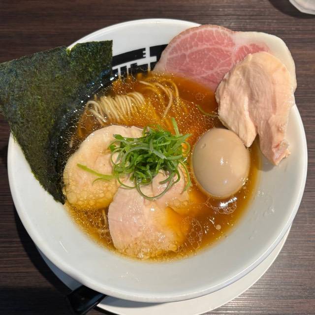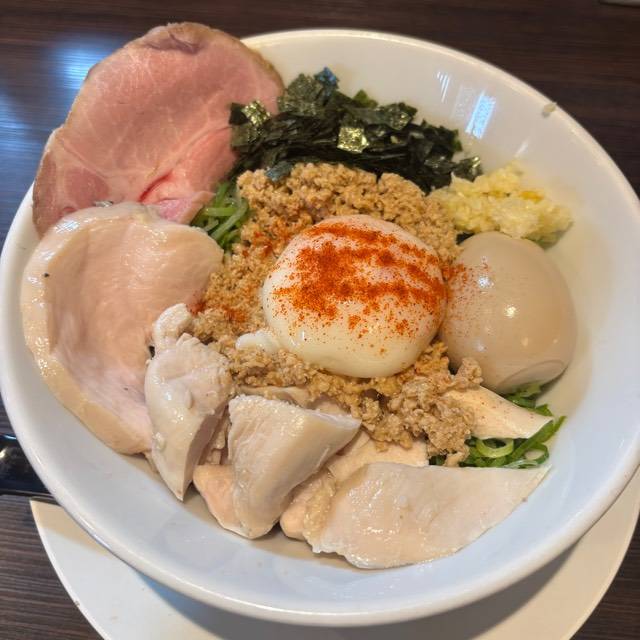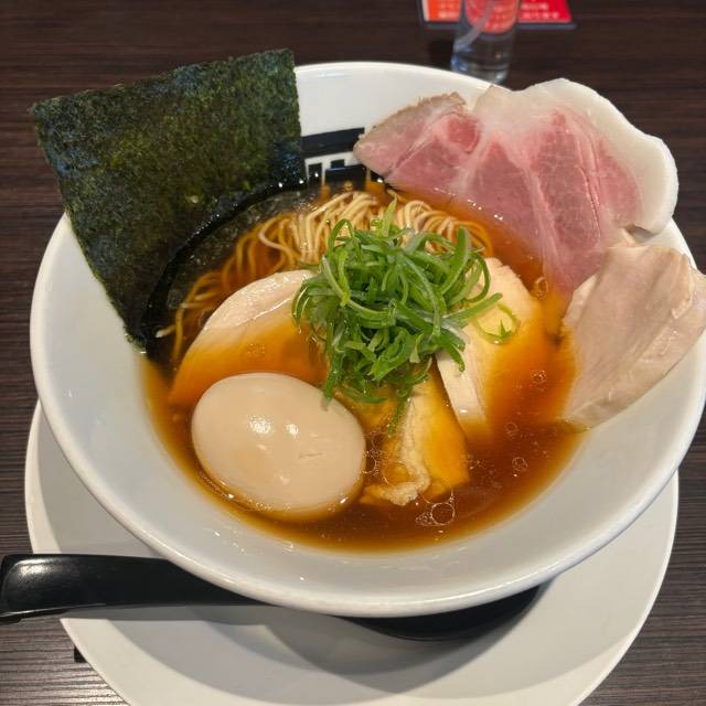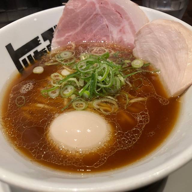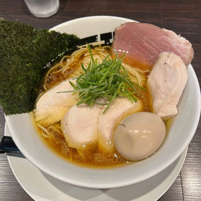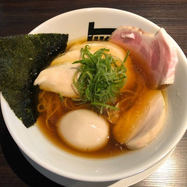 北海道産超強力粉「ゆめちから」100%の自家製麺。低加水の中太ストレート麺は、歯切れが良く、心地よい麦の香りがする。京地鶏の丸鶏、ガラ、モミジを使ったベースに、複数の節を合わせたスープの「醤油らぁめん」。「塩らぁめん」は、ベースに昆布や煮干にした牡蠣、帆立貝を加えたコクのある味わい。トッピングは低温で真空調理した胸肉。しっとりした肉質で、スープとも好相性である。