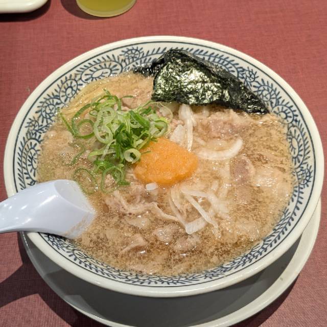 やわらかな豚肉をスープで炊き込むことでスープの旨みを染み込ませました。 麺に肉とスープの旨みが絡み、口の中に広がる至福の味! スープはトロッとまろやかな味。それが丸源名物「肉そば」。